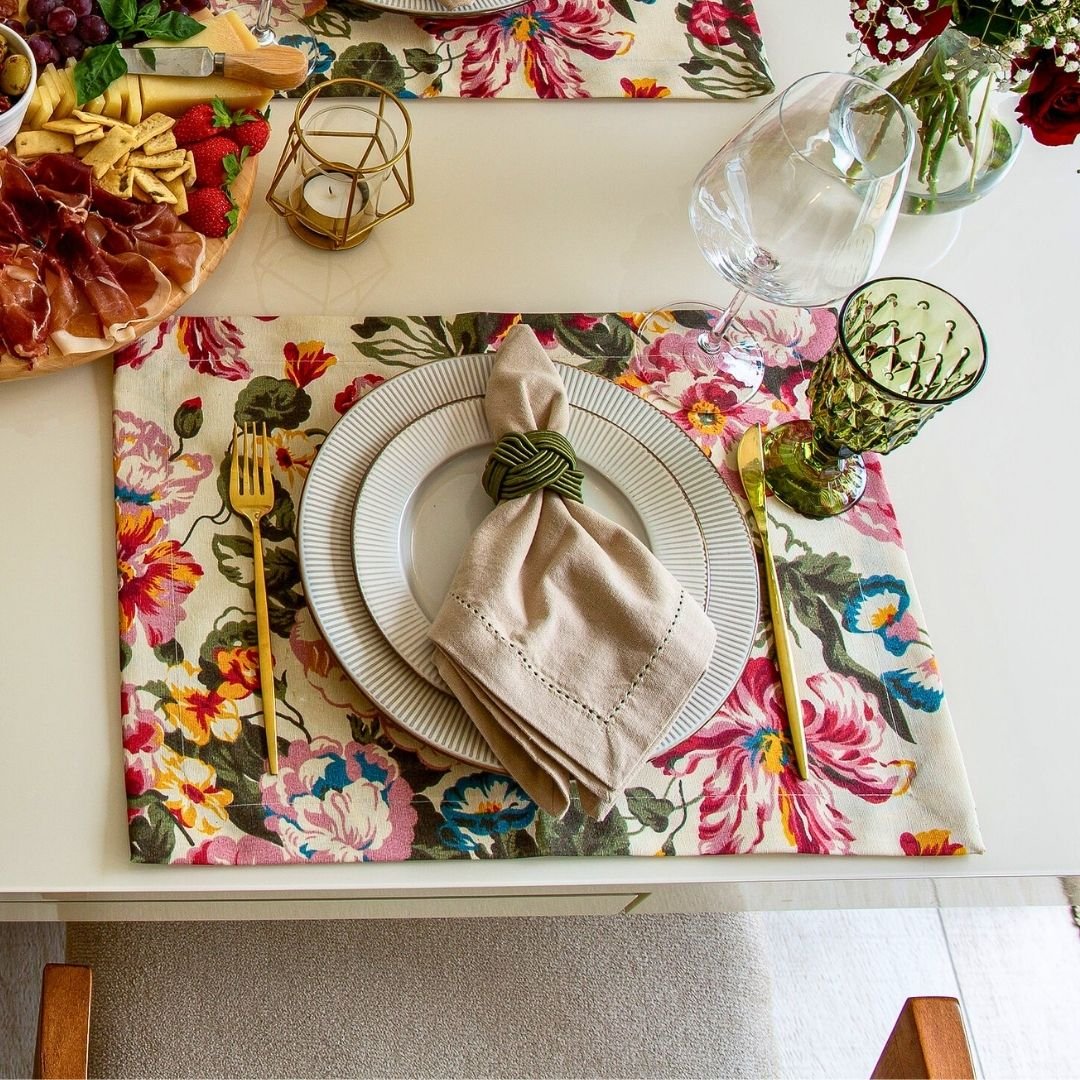 Placemats with a soft floral print, made from Verona fabric. Ideal for delicate and themed table settings. Artisanally made in Brazil.